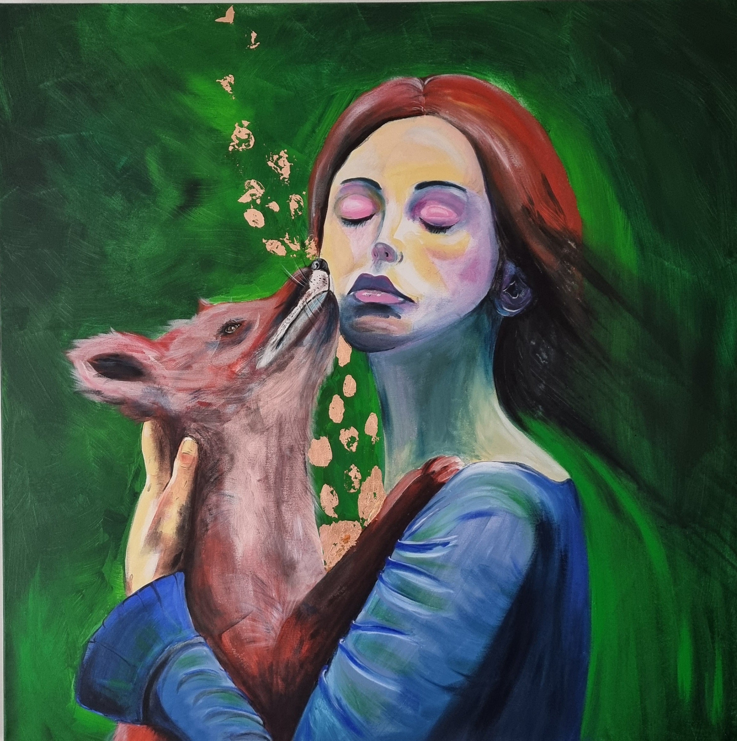 In dieser Komposition habe ich das Gefühl von Liebe und Geborgenheit umsetzten wollen. Die Frau hält mit geschlossenen Augen den Fuchs an ihre Wange. Der Fuchs streckt seine Schnauze, etwas steif und verhalten in ihre Richtung. Vertrauen ist eine Haltung bei der Liebe wachsen kann.